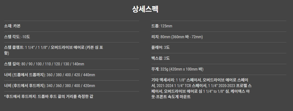 1-1/4”, 1-1/8” 및 카본 심이 포함된 오버드라이브 에어로 스티어러 튜브와 호환 가능.
