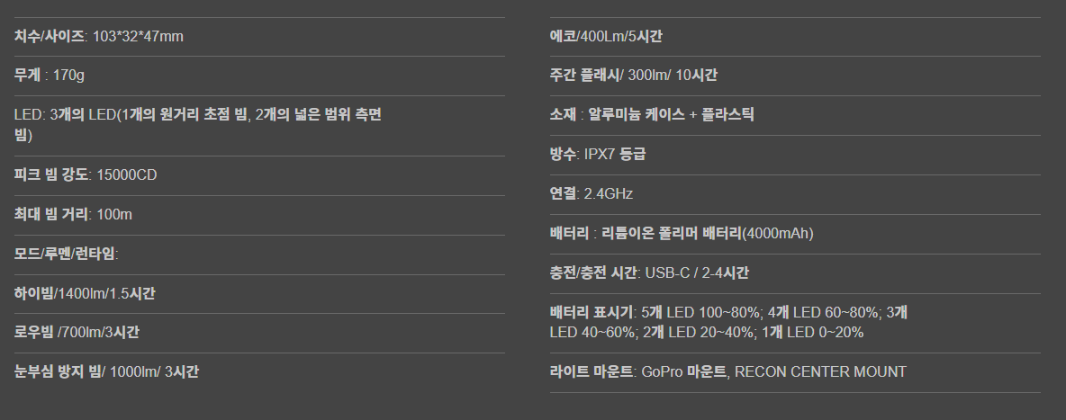 | 듀얼 존 광학 렌즈, 알루미늄 냉각 핀, 외부 전원 팩을 갖춘 Recon+ HL 1400은 지금까지 출시된 가장 강력한 Recon 헤드라이트인 Recon HL 3000 및 HL 4500과 동일한 기술을 자랑하며, 최대 250m까지 매우 밝은 광각 빔을 투사합니다. |