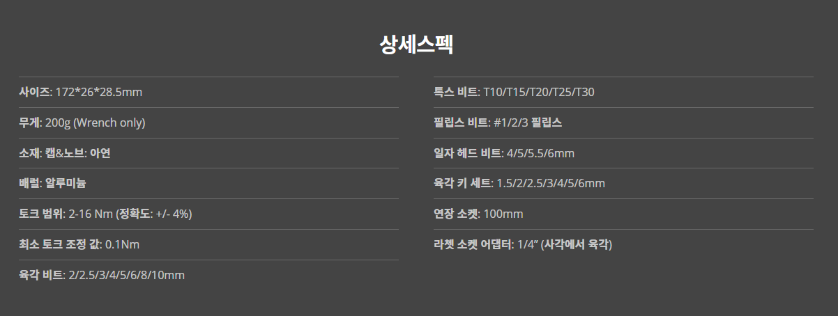 PERFECT TORQUE 자이언트 어드저스터블 토크 렌치와 미니 토크 드라이버는 토크에 도달했을 때 들리는 딸깍 소리와 함께 빠르고 정확하게 토크 값을 세팅할 수 있습니다. 어드저스터블 토크 렌치에는 육각, 톡스 및 스크루드라이버 비트가 포함된 전체 툴 키트, 육각 렌치, 소켓 익스텐더를 보관할 수 있는 편리한 휴대용 케이스가 있습니다. |