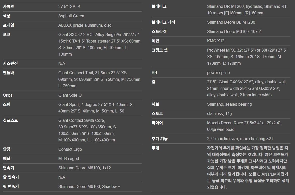 | Liv Tempt는 산악 자전거의 문을 열고, 험난한 산길을 탐험하고 그 어느 때보다 야외를 경험하도록 초대합니다. 하지만 거기서 끝나지 않습니다. 이 다재다능한 자전거는 도시 거리에서도 마찬가지로 편안하며, 여정이 어디로 향하든 여러분을 데려갈 준비가 되어 있습니다. 모던 MTB 디자인 테이퍼링된 스티어러 튜브*, 클러치가 장착된 리어 드레일러와 1x 구동계*를 포함한 뛰어난 폼질의 컴포넌트, 쓰루 액슬 허브*, 인터널 케이블 라우팅(드롭퍼 싯포스트 포함), 그리고 통합형 체인 스테이 프로텍터는 열정적인 트레일 라이더들이 성장할 수 있는 힘을 줍니다. (*일부 모델에서 제공) 오프로드 컨트롤 새로운 지오메트리는 자신 있는 트레일 라이딩, 프레임 사이즈에 따른 두가지 휠 사이즈(27.5인치, 29인치)에 최적화되었습니다. 또한 프레임 사이즈에 따라 80mm 혹은 100mm 포크를 장착한 프론트 서스펜션에 맞춰 설계되었습니다. 모든 모델은 최대 2.4인치 대용량 타이어까지 사용할 수 있는 충분한 클리어런스를 갖춰, 기술적인 지형에서 뛰어난 견인력과 접지력을 선보입니다. 가벼운 무게, 뛰어난 내구성 최신 ALUXX 알루미늄 프레임은 업데이트된 쉐이핑, 가벼운 무게를 제공하며 오프로드 지형에서 향상된 퍼포먼스를 발휘합니다. |