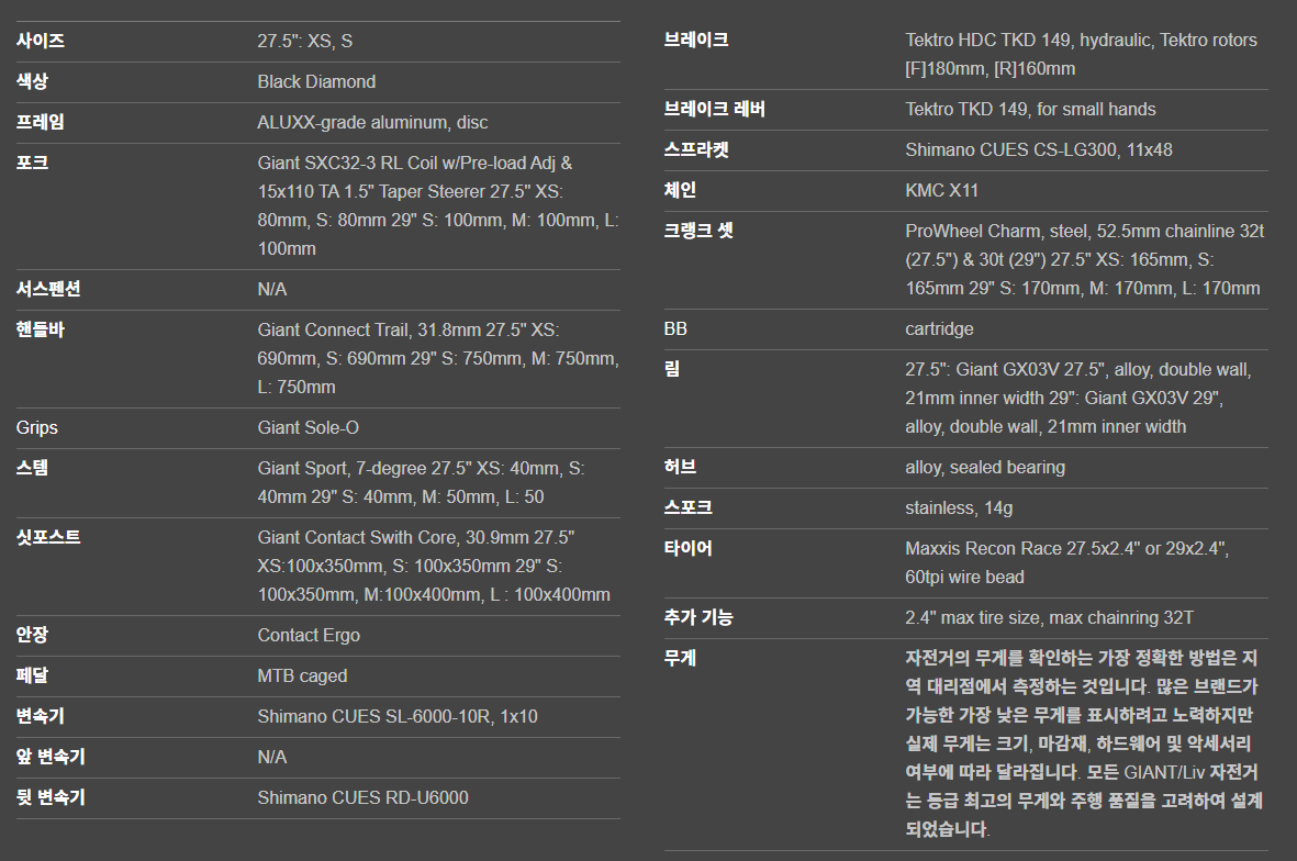 | Liv Tempt는 산악 자전거의 문을 열고, 험난한 산길을 탐험하고 그 어느 때보다 야외를 경험하도록 초대합니다. 하지만 거기서 끝나지 않습니다. 이 다재다능한 자전거는 도시 거리에서도 마찬가지로 편안하며, 여정이 어디로 향하든 여러분을 데려갈 준비가 되어 있습니다. 모던 MTB 디자인 테이퍼링된 스티어러 튜브*, 클러치가 장착된 리어 드레일러와 1x 구동계*를 포함한 뛰어난 폼질의 컴포넌트, 쓰루 액슬 허브*, 인터널 케이블 라우팅(드롭퍼 싯포스트 포함), 그리고 통합형 체인 스테이 프로텍터는 열정적인 트레일 라이더들이 성장할 수 있는 힘을 줍니다. (*일부 모델에서 제공) 오프로드 컨트롤 새로운 지오메트리는 자신 있는 트레일 라이딩, 프레임 사이즈에 따른 두가지 휠 사이즈(27.5인치, 29인치)에 최적화되었습니다. 또한 프레임 사이즈에 따라 80mm 혹은 100mm 포크를 장착한 프론트 서스펜션에 맞춰 설계되었습니다. 모든 모델은 최대 2.4인치 대용량 타이어까지 사용할 수 있는 충분한 클리어런스를 갖춰, 기술적인 지형에서 뛰어난 견인력과 접지력을 선보입니다. 가벼운 무게, 뛰어난 내구성 최신 ALUXX 알루미늄 프레임은 업데이트된 쉐이핑, 가벼운 무게를 제공하며 오프로드 지형에서 향상된 퍼포먼스를 발휘합니다. |