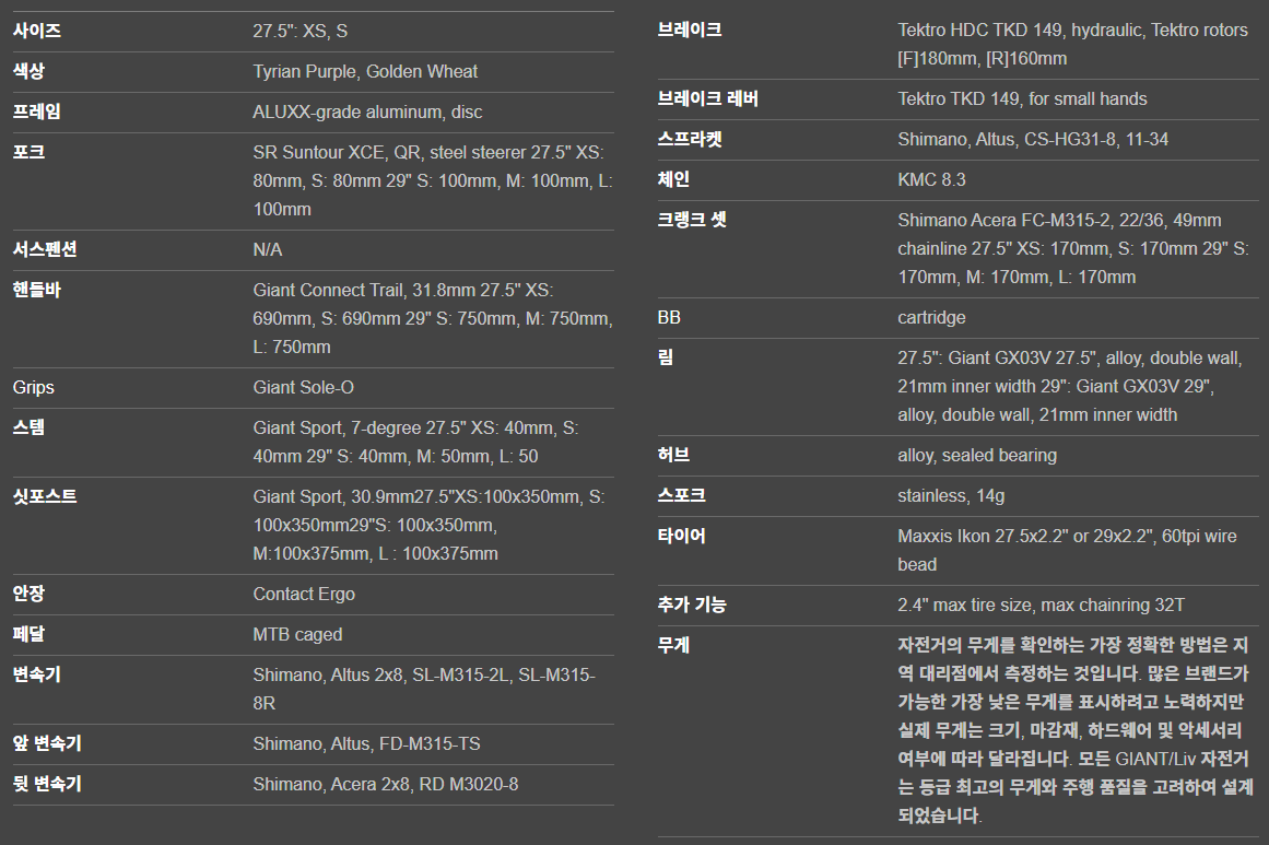 | Liv Tempt는 산악 자전거의 문을 열고, 험난한 산길을 탐험하고 그 어느 때보다 야외를 경험하도록 초대합니다. 하지만 거기서 끝나지 않습니다. 이 다재다능한 자전거는 도시 거리에서도 마찬가지로 편안하며, 여정이 어디로 향하든 여러분을 데려갈 준비가 되어 있습니다. 모던 MTB 디자인 테이퍼링된 스티어러 튜브*, 클러치가 장착된 리어 드레일러와 1x 구동계*를 포함한 뛰어난 폼질의 컴포넌트, 쓰루 액슬 허브*, 인터널 케이블 라우팅(드롭퍼 싯포스트 포함), 그리고 통합형 체인 스테이 프로텍터는 열정적인 트레일 라이더들이 성장할 수 있는 힘을 줍니다. (*일부 모델에서 제공) 오프로드 컨트롤 새로운 지오메트리는 자신 있는 트레일 라이딩, 프레임 사이즈에 따른 두가지 휠 사이즈(27.5인치, 29인치)에 최적화되었습니다. 또한 프레임 사이즈에 따라 80mm 혹은 100mm 포크를 장착한 프론트 서스펜션에 맞춰 설계되었습니다. 모든 모델은 최대 2.4인치 대용량 타이어까지 사용할 수 있는 충분한 클리어런스를 갖춰, 기술적인 지형에서 뛰어난 견인력과 접지력을 선보입니다. 가벼운 무게, 뛰어난 내구성 최신 ALUXX 알루미늄 프레임은 업데이트된 쉐이핑, 가벼운 무게를 제공하며 오프로드 지형에서 향상된 퍼포먼스를 발휘합니다. |