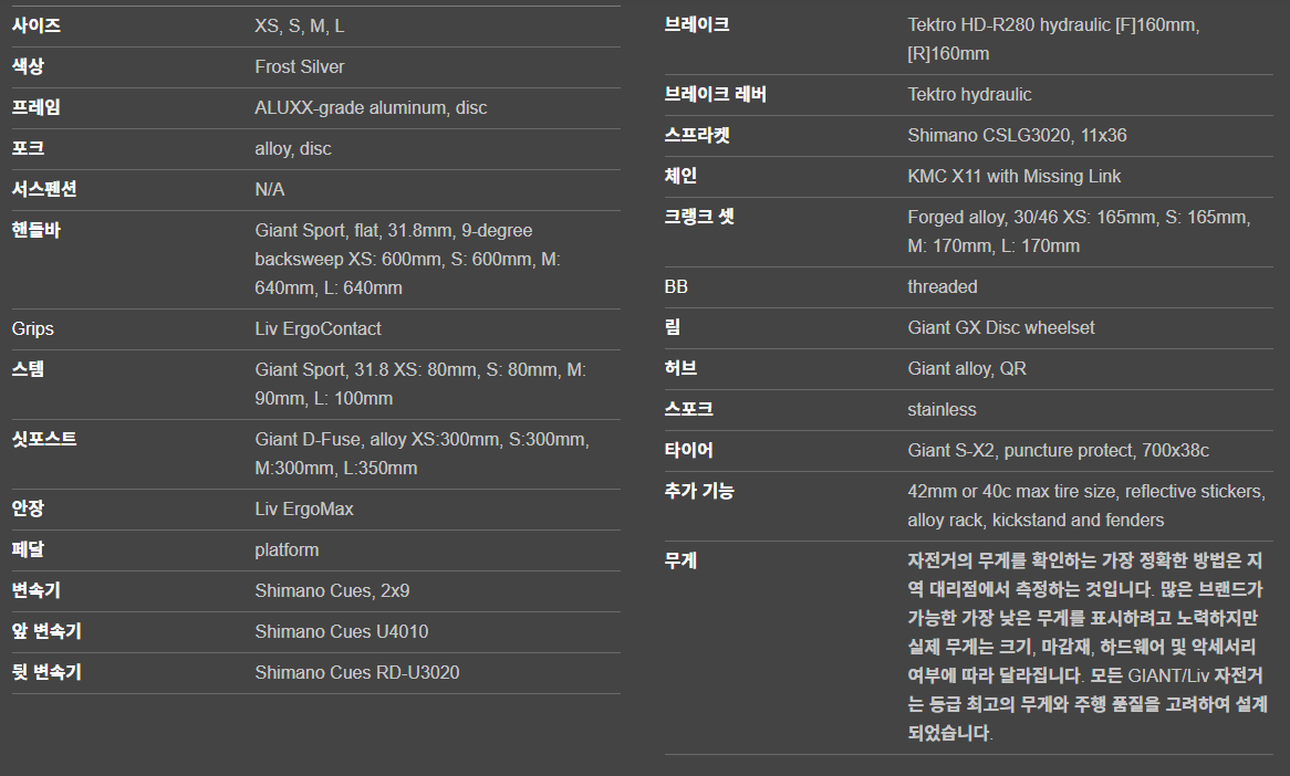 Alight Disc는 쉽게 탈부착할 수 있는 프레임 디자인과 편안함을 극대화한 터치포인트가 특징이며, 펜더, 랙, 킥스탠드가 장착된 Alight Disc City 모델로 제공되어 자전거 도로에서의 라이딩이나 출퇴근을 더욱 즐겁게 만들어줍니다. Versatility Alight에 포함된 펜더, 리어 랙, 킥스탠드(일부 모델)로 간편하게 심부름을 하세요. Comfort 도시 곳곳을 달릴 때 편안함을 유지하는 것은 타협할 수 없는 문제이므로, Alight는 탈부착이 편리한 프레임을 갖추고 있으며, 충격 흡수 그립, 압박감을 완화해주는 안장, 서스펜션 시트포스트와 함께 제공됩니다. Control Alight의 강력한 디스크 브레이크는 건조하거나 젖은 조건에서 작동하며, 포크 클리어런스가 늘어나 최대 40c 타이어를 장착하여 더 큰 견인력을 얻을 수 있습니다. |