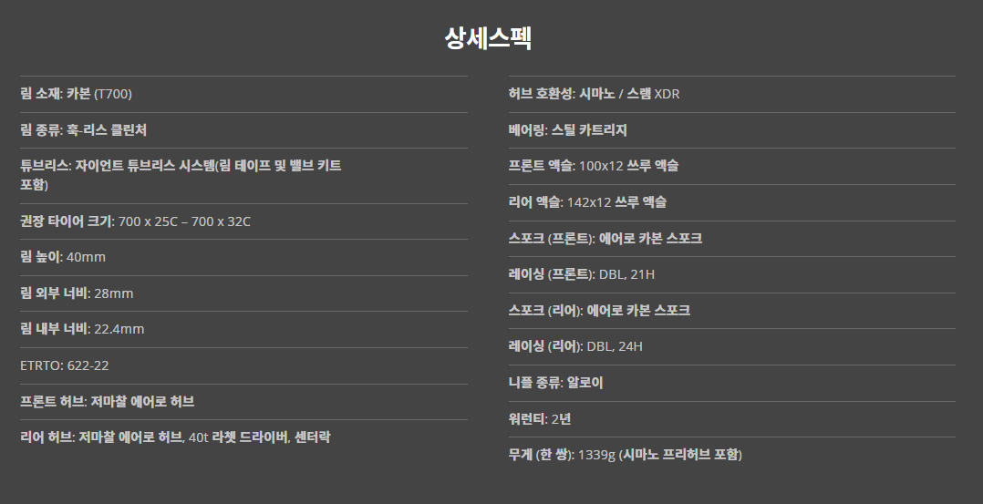 - 윈드 터널 테스트에서 그 성능을 입증하고 공기역학적인 이점을 제공하는 40mm 훅-리스 림 프로파일
